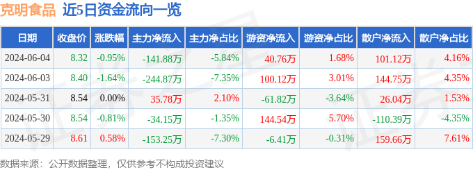 股票行情快报:克明食品(002661)6月4日主力资金净卖出141.88万元