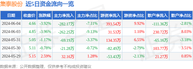 股票行情快报:集泰股份(002909)6月4日主力资金净卖出282.17万元