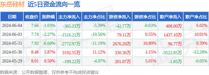 股票行情快报:东岳硅材(300821)6月4日主力资金净卖出365.23万元