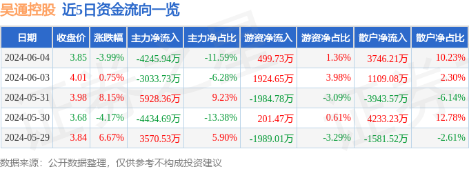 股票行情快报:吴通控股(300292)6月4日主力资金净卖出4245.94万元