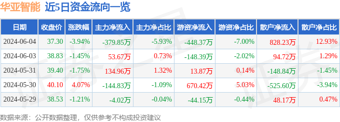 股票行情快报:华亚智能(003043)6月4日主力资金净卖出379.85万元