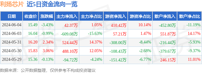 利扬芯片(688135)6月4日主力资金净买入42.37万元