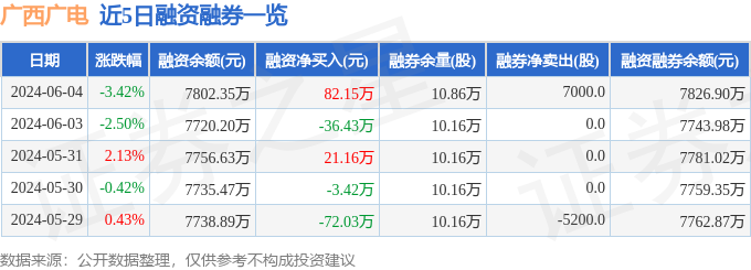 广西广电融资融券信息显示,融资方面,当日融资买入141.12万元,融资偿还58.97万元,融资净买入82.15万元。融券方面,融券卖出7000.0股,融券偿还0.0股,融券余量10.86万股,融券余额24.54万元。融资融券余额7826.9万元。近5日融资融券数据一览见下表: