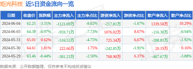 财经消息,截至2024年6月4日收盘,炬光科技(688167)报收于62.25元,下跌3.31%,换手率3.05%,成交量2.1万手,成交额1.3亿元。