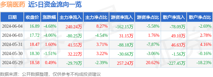 多瑞医药(301075)6月4日主力资金净买入240.24万元