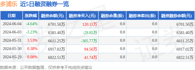 多浦乐融资融券信息显示,融资方面,当日融资买入322.25万元,融资偿还202.14万元,融资净买入120.11万元。融券方面,融券卖出0.0股,融券偿还0.0股,融券余量0.0股,融券余额0.0万元。融资融券余额6701.5万元。近5日融资融券数据一览见下表:
