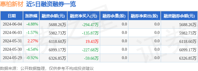 惠柏新材融资融券信息显示,融资方面,当日融资买入488.7万元,融资偿还783.17万元,融资净偿还294.47万元。融券方面,融券卖出0.0股,融券偿还0.0股,融券余量0.0股,融券余额0.0万元。融资融券余额5688.26万元。近5日融资融券数据一览见下表: