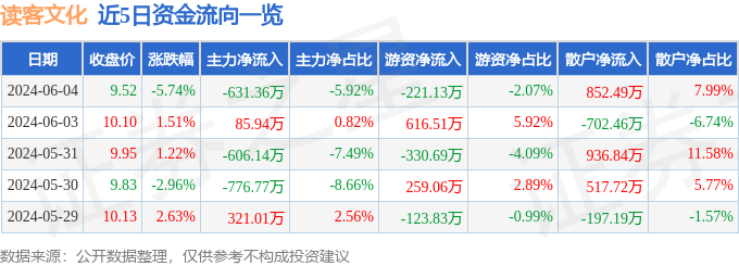 读客文化(301025)6月4日主力资金净卖出631.36万元