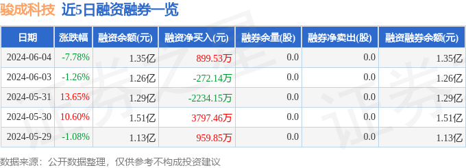 骏成科技融资融券信息显示,融资方面,当日融资买入2968.4万元,融资偿还2068.86万元,融资净买入899.53万元。融券方面,融券卖出0.0股,融券偿还0.0股,融券余量0.0股,融券余额0.0万元。融资融券余额1.35亿元。近5日融资融券数据一览见下表: