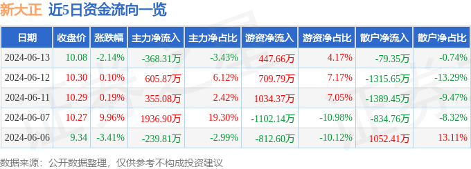股票行情快报:新大正(002968)6月13日主力资金净卖出368.31万元