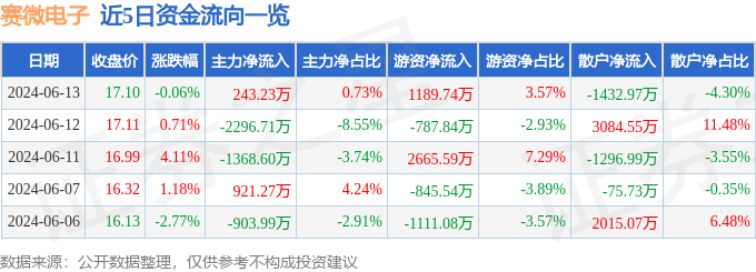 6月13日的资金流向数据方面,主力资金净流入243.23万元,占总成交额0.73%,游资资金净流入1189.74万元,占总成交额3.57%,散户资金净流出1432.97万元,占总成交额4.3%。