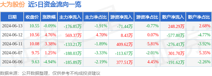 股票行情快报:大为股份(002213)6月13日主力资金净卖出176.85万元
