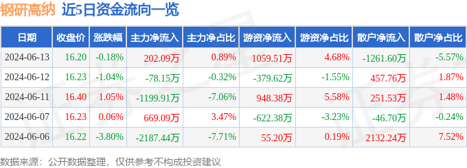 财经消息,截至2024年6月13日收盘,钢研高纳(300034)报收于16.2元,下跌0.18%,换手率1.83%,成交量14.01万手,成交额2.26亿元。