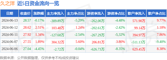 6月13日的资金流向数据方面,主力资金净流出309.89万元,占总成交额5.29%,游资资金净流出262.0万元,占总成交额4.48%,散户资金净流入571.9万元,占总成交额9.77%。