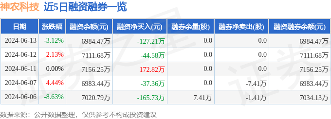 神农科技融资融券信息显示,融资方面,当日融资买入67.61万元,融资偿还194.81万元,融资净偿还127.21万元。融券方面,融券卖出0.0股,融券偿还0.0股,融券余量0.0股,融券余额0.0万元。融资融券余额6984.47万元。近5日融资融券数据一览见下表: