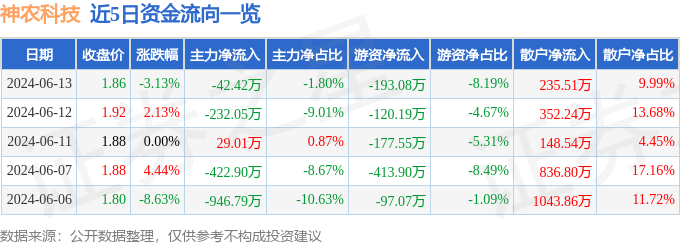 财经消息,截至2024年6月13日收盘,神农科技(300189)报收于1.86元,下跌3.12%,换手率1.41%,成交量12.51万手,成交额2356.83万元。