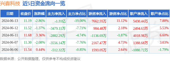 6月13日的资金流向数据方面,主力资金净流出1.31亿元,占总成交额19.0%,游资资金净流入7662.55万元,占总成交额11.12%,散户资金净流入5430.44万元,占总成交额7.88%。