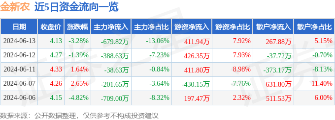 金新农(002548)6月13日主力资金净卖出679.82万元
