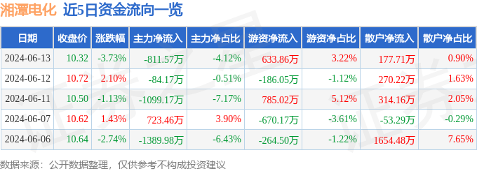 湘潭电化(002125)6月13日主力资金净卖出811.57万元