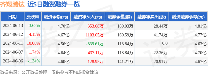 齐翔腾达融资融券信息显示,融资方面,当日融资买入3231.83万元,融资偿还2878.75万元,融资净买入353.08万元。融券方面,融券卖出37.74万股,融券偿还9.3万股,融券余量189.03万股,融券余额1098.24万元。融资融券余额4.81亿元。近5日融资融券数据一览见下表: