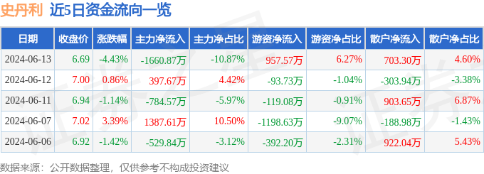 史丹利(002588)6月13日主力资金净卖出1660.87万元