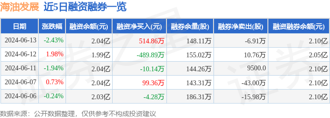 海油发展融资融券信息显示,融资方面,当日融资买入860.82万元,融资偿还345.96万元,融资净买入514.86万元。融券方面,融券卖出2.76万股,融券偿还9.67万股,融券余量148.11万股,融券余额595.42万元。融资融券余额2.1亿元。近5日融资融券数据一览见下表:
