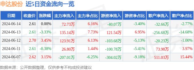 6月14日的资金流向数据方面,主力资金净流入72.73万元,占总成交额6.16%,游资资金净流出40.07万元,占总成交额3.4%,散户资金净流出32.66万元,占总成交额2.77%。