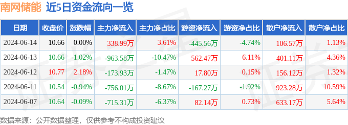 股票行情快报:南网储能(600995)6月14日主力资金净买入338.99万元
