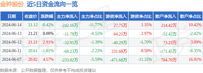 股票行情快报:金钟股份(301133)6月14日主力资金净卖出242.16万元