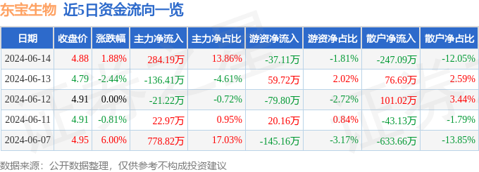 股票行情快报:东宝生物(300239)6月14日主力资金净买入284.19万元