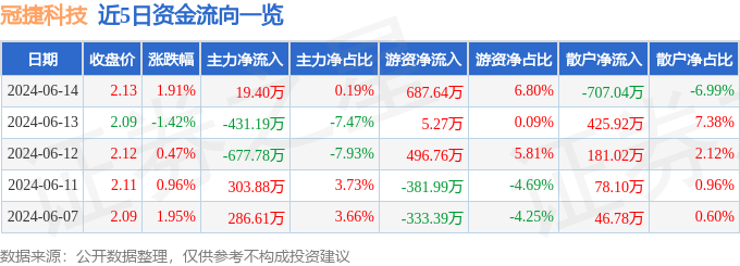 股票行情快报:冠捷科技(000727)6月14日主力资金净买入19.40万元