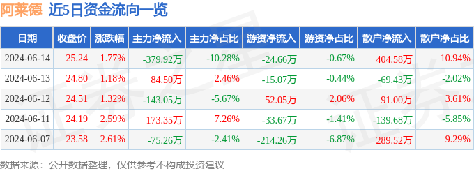 股票行情快报:阿莱德(301419)6月14日主力资金净卖出379.92万元