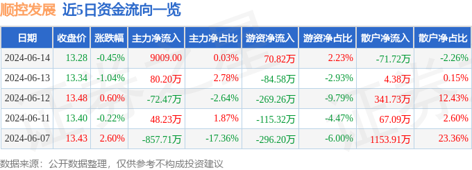 股票行情快报:顺控发展(003039)6月14日主力资金净买入9009.00元