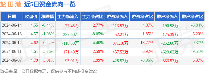 股票行情快报:盐田港(000088)6月14日主力资金净买入77.45万元