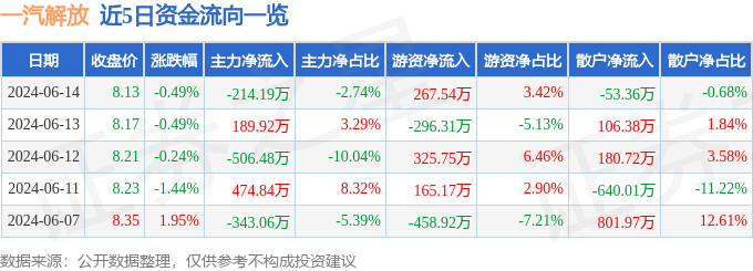 财经消息,截至2024年6月14日收盘,一汽解放(000800)报收于8.13元,下跌0.49%,换手率0.21%,成交量9.66万手,成交额7830.37万元。