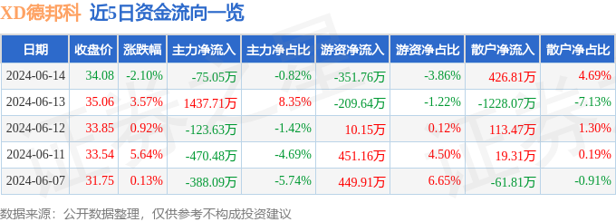 XD德邦科(688035)6月14日主力资金净卖出75.05万元