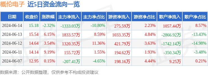 6月14日的资金流向数据方面,主力资金净流出1333.03万元,占总成交额10.8%,游资资金净流入275.59万元,占总成交额2.23%,散户资金净流入1057.44万元,占总成交额8.57%。