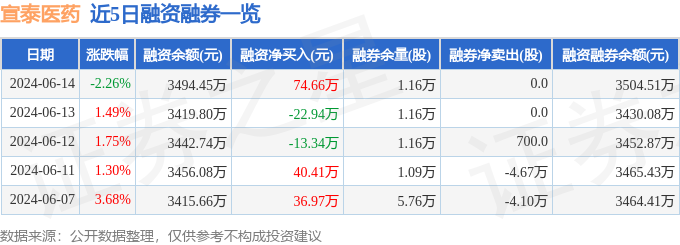 宣泰医药融资融券信息显示,融资方面,当日融资买入171.79万元,融资偿还97.13万元,融资净买入74.66万元。融券方面,融券卖出0.0股,融券偿还0.0股,融券余量1.16万股,融券余额10.05万元。融资融券余额3504.51万元。近5日融资融券数据一览见下表: