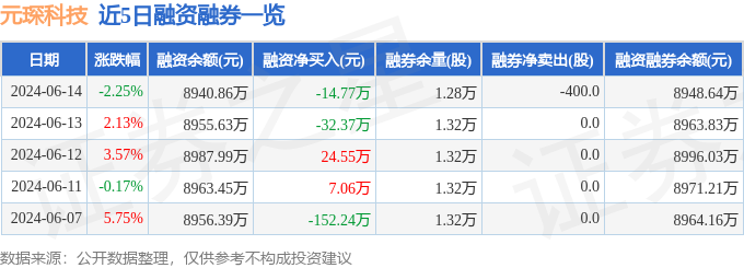 元琛科技融资融券信息显示,融资方面,当日融资买入73.08万元,融资偿还87.85万元,融资净偿还14.77万元。融券方面,融券卖出0.0股,融券偿还400.0股,融券余量1.28万股,融券余额7.78万元。融资融券余额8948.64万元。近5日融资融券数据一览见下表: