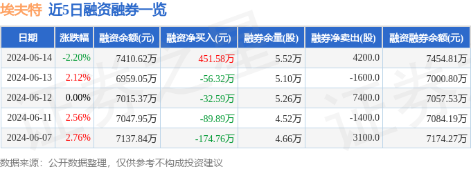 埃夫特融资融券信息显示,融资方面,当日融资买入602.97万元,融资偿还151.4万元,融资净买入451.58万元。融券方面,融券卖出5000.0股,融券偿还800.0股,融券余量5.52万股,融券余额44.19万元。融资融券余额7454.81万元。近5日融资融券数据一览见下表: