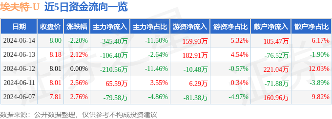 6月14日的资金流向数据方面,主力资金净流出345.4万元,占总成交额11.5%,游资资金净流入159.93万元,占总成交额5.32%,散户资金净流入185.47万元,占总成交额6.17%。