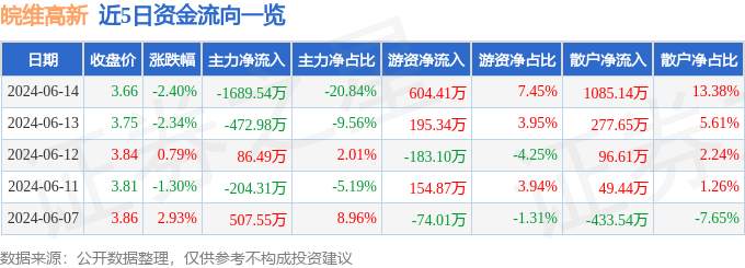 6月14日的资金流向数据方面,主力资金净流出1689.54万元,占总成交额20.84%,游资资金净流入604.41万元,占总成交额7.45%,散户资金净流入1085.14万元,占总成交额13.38%。