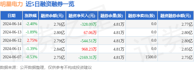 明星电力融资融券信息显示,融资方面,当日融资买入9791.17万元,融资偿还1.01亿元,融资净偿还328.09万元。融券方面,融券卖出0.0股,融券偿还0.0股,融券余量4.81万股,融券余额70.56万元。融资融券余额2.77亿元。近5日融资融券数据一览见下表: