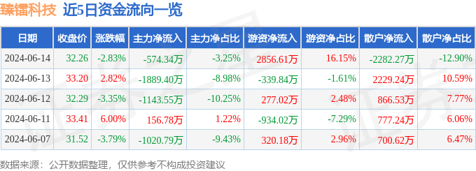 6月14日的资金流向数据方面,主力资金净流出574.34万元,占总成交额3.25%,游资资金净流入2856.61万元,占总成交额16.15%,散户资金净流出2282.27万元,占总成交额12.9%。