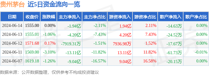 股票行情快报:贵州茅台(600519)6月14日主力资金净卖出1.94亿元