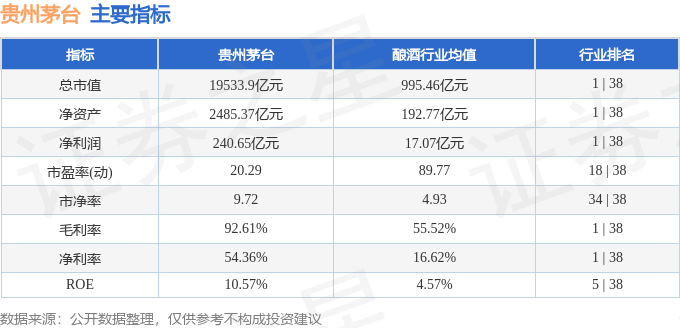 贵州茅台2024年一季报显示,公司主营收入464.85亿元,同比上升18.04%;归母净利润240.65亿元,同比上升15.73%;扣非净利润240.51亿元,同比上升15.75%;负债率12.95%,投资收益128.36万元,财务费用-4.87亿元,毛利率92.61%。贵州茅台(600519)主营业务:茅台酒及系列酒的生产与销售。