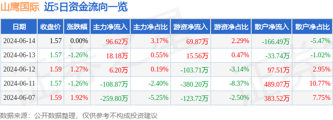 股票行情快报:山鹰国际(600567)6月14日主力资金净买入96.62万元