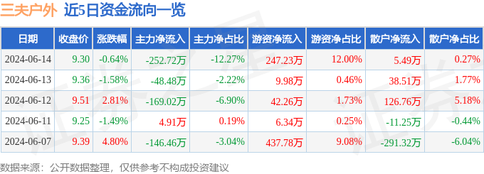 股票行情快报:三夫户外(002780)6月14日主力资金净卖出252.72万元