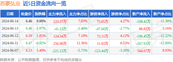 6月14日的资金流向数据方面,主力资金净流入123.37万元,占总成交额7.03%,游资资金净流入75.05万元,占总成交额4.27%,散户资金净流出198.42万元,占总成交额11.3%。