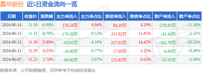 股票行情快报:嘉华股份(603182)6月14日主力资金净买入176.54万元